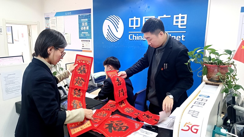营业厅的窗口是广电网络与用户之间最直接的温情纽带。年前,沈阳铁西区域三公司员工认真做好节日排班人员部署,确保年前缴费高峰的有效保障。他们还自己书写了一批春联和福字,在缴费高峰期为广大用户增添了一丝温情和节日祝福。