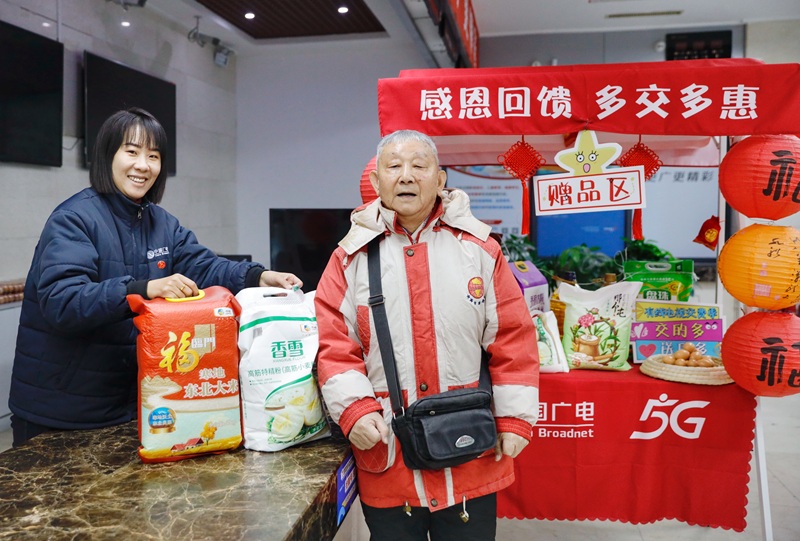 春节期间正值鞍山市分公司集中收费期。为感恩回馈广大有线电视用户,鞍山公司推出多交多惠、预存两年以上收视费送米面油活动,在营业厅设置赠品实物展位。此政策很有吸引力,用户积极交费参与。照片中是营业员为办理多预存交费用户发放赠品米面的场面,捕捉用户接到营业员递来的赠品开心的时刻。