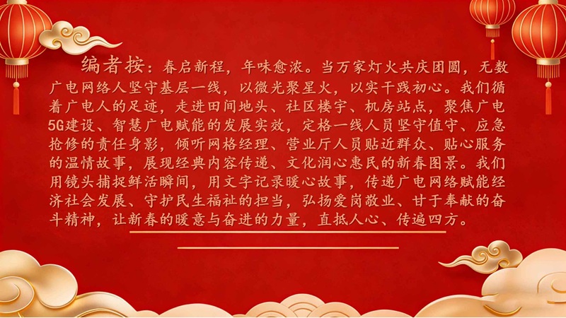 这份坚守,不仅是对岗位的承诺,更是“用户至上”服务理念的生动实践。从话务员个人到中国广电整个服务团队,她们用专业技能筑牢服务防线,用昼夜值守扛起责任担当,用暖心服务化解用户难题,让广大用户的春节假期更加安心、舒心。在这个喜庆的节日里,中国广电话务员以声音为炬,照亮万家团圆路,用实际行动诠释着“坚守岗位守初心,服务为民暖新春”的深刻内涵。