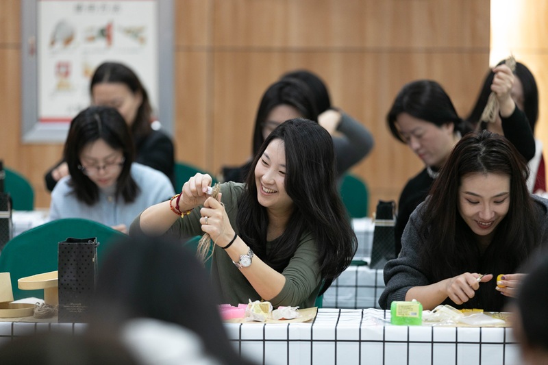 理论讲解结束后,伴随着舒缓悠扬的音乐旋律,活动进入了最热闹的制作环节。平日里握着鼠标、敲击键盘的她们,此刻化身为指尖生巧的 “魔法师”女职工们兴致盎然,纷纷投入到忘我的创作中。大家小心翼翼地拿着小刀,仔细地修整着每一颗“葡萄”的棱角,力求让其呈现出宝石般的光泽。