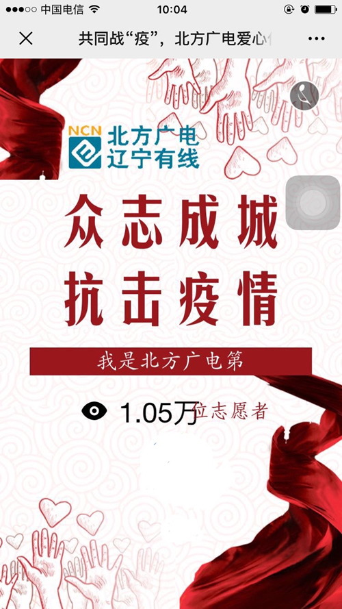 为践行志愿精神,汇聚内外力量,坚定战“疫”信心,2月4日,北方广电以“众志成城,抗击疫情”为主题开展“志愿者爱心传递活动”。