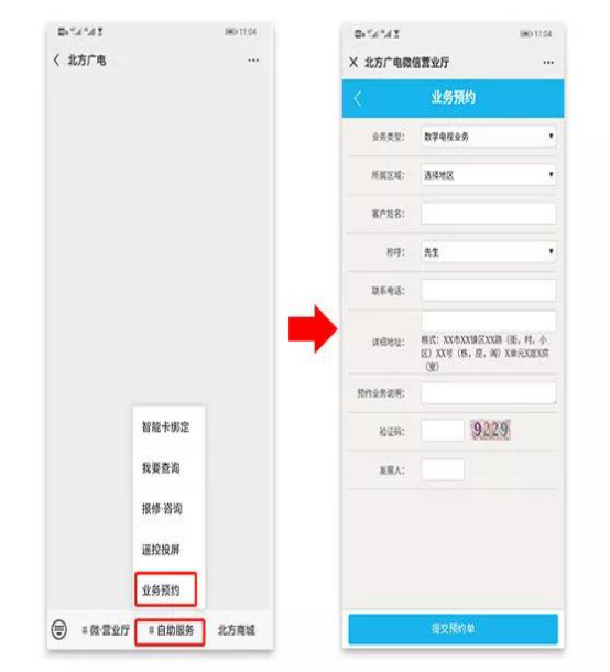 关注北方广电微信服务号,选择菜单下方“自助服务—业务预约”,即可预约您想办理的业务。