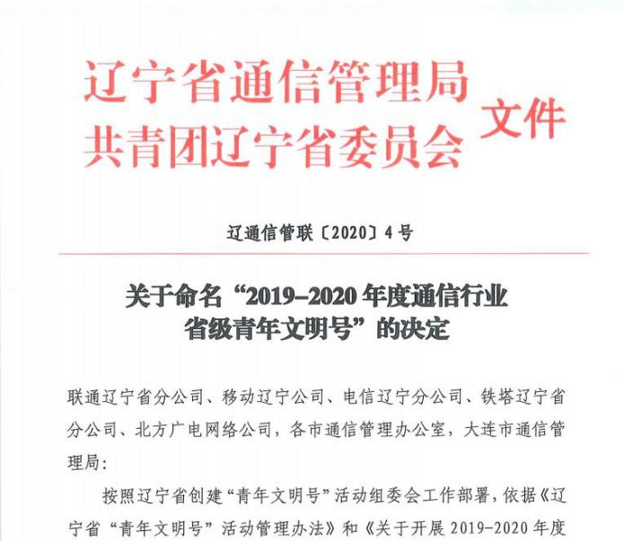 2020年7月初,辽宁省“青年文明号”活动组委会启动了创建活动。5个月的时间,全省多家通信行业企业精心组织实施、积极参评活动。最终经过活动组委会审核评选,辽宁省通信管理局和共青团辽宁省委员会决定命名北方广电网络公司信息科技服务分公司呼叫运营中心、北方广电网络公司沈阳分公司铁西区域二公司北一路营业厅等10个通信行业集体为“2019-2020年度通信行业省级青年文明号”。