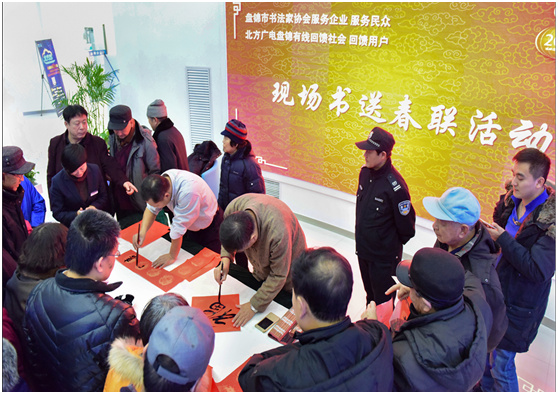 “猴去灵动在,鸡来福气生”,为贴近客户,节前造势,营造欢乐祥和的新年、春节假日期间营销宣传氛围,2016年12月29日,北方广电网络公司盘锦分公司、盘锦市书法家协会联合举办“书法名家现场送春联”活动。十八位书法家同时挥毫泼墨为用户和市民送上丁酉年的第一份新春祝福。