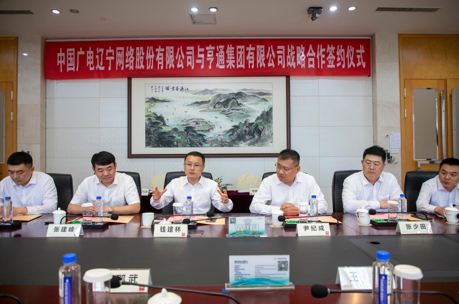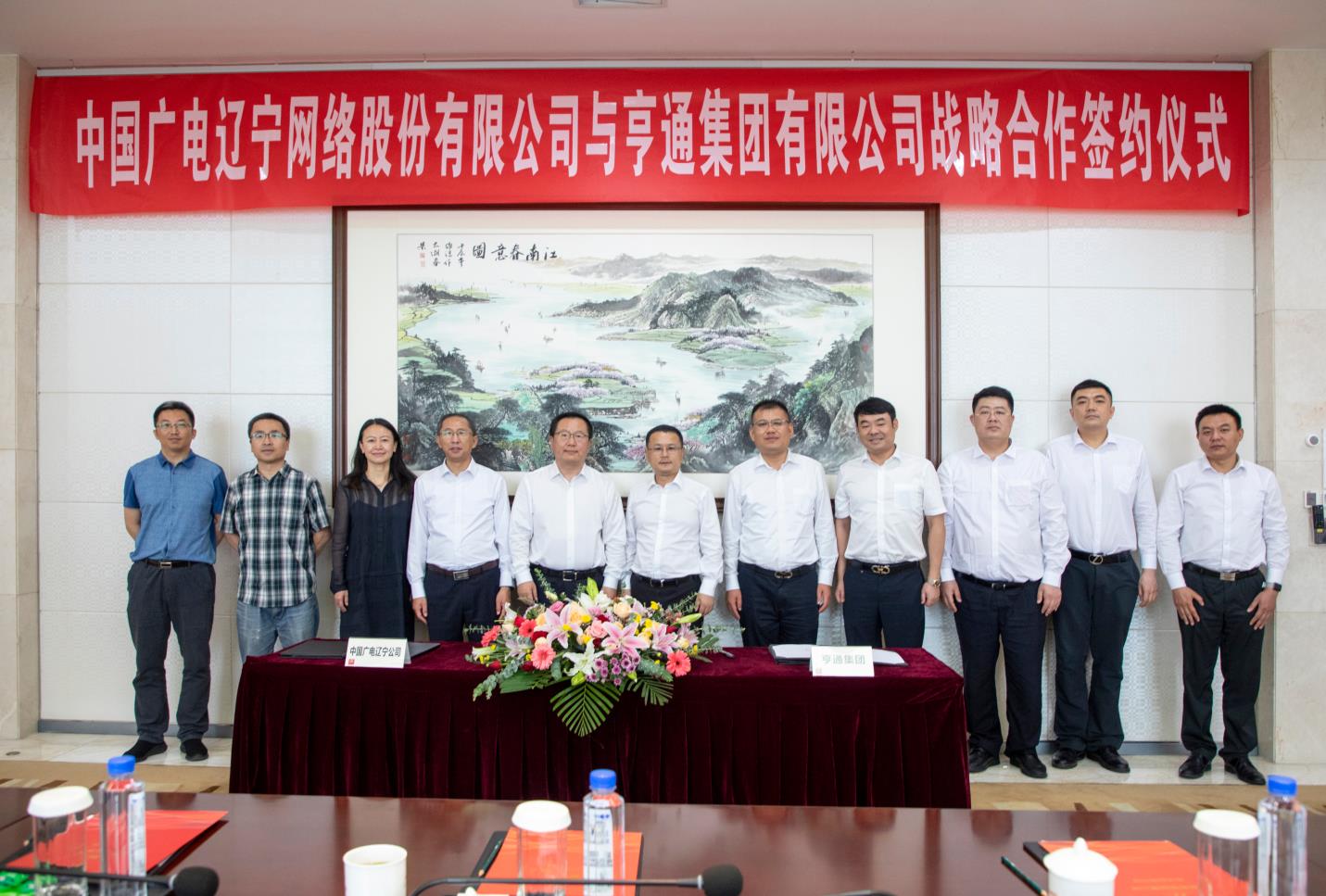 2021年6月4日上午,太阳成集团tyc(简称辽宁广电)与亨通集团有限公司(简称亨通集团)战略合作协议签约仪式在苏州亨通集团总部举行。辽宁广电党委书记、董事长、总经理曾绍武,总工程师王兆恒,总经理助理王婷与亨通集团执行总裁钱建林,运营管理中心总经理尹纪成,通信产业集团副总裁、亨通光电总经理张建峰出席了签约仪式。