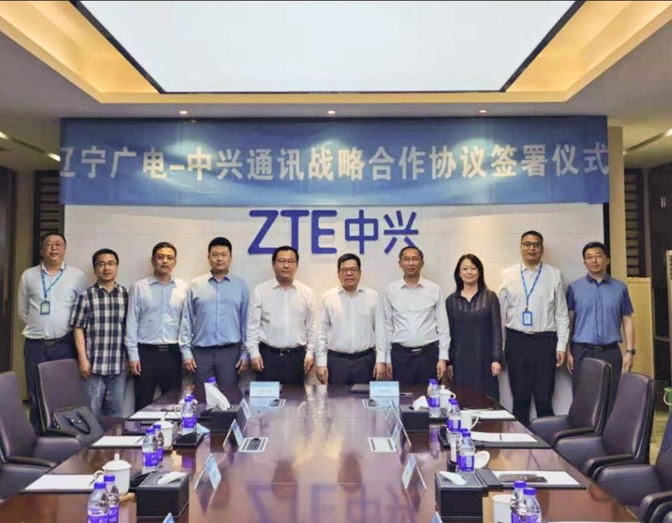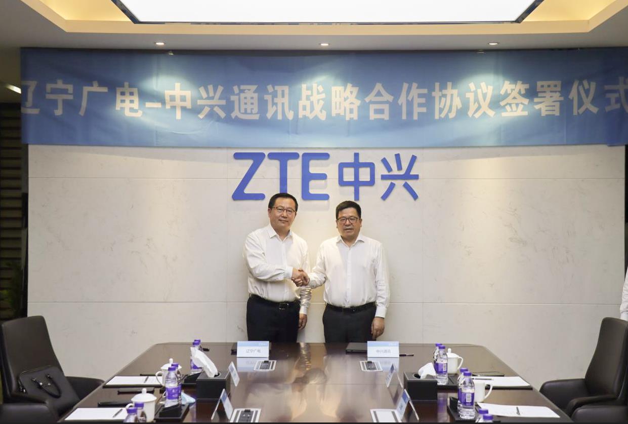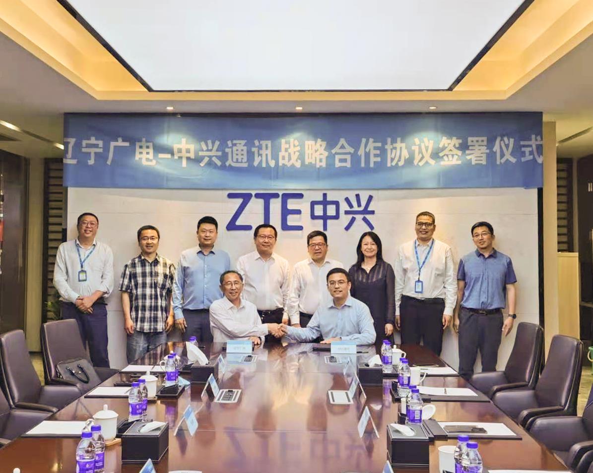 2021年6月5日,太阳成集团tyc(简称辽宁广电)与中兴通讯股份有限公司(简称中兴通讯)战略合作协议签约仪式在中兴通讯南京研发中心举行。辽宁广电党委书记、董事长、总经理曾绍武,总工程师王兆恒,总经理助理王婷与中兴通讯董事长、执行董事李自学,副总裁张亮出席仪式,共同见证签约。