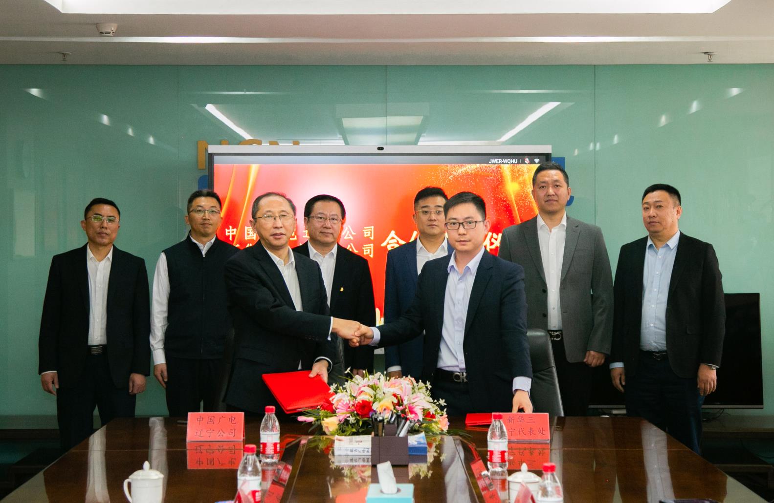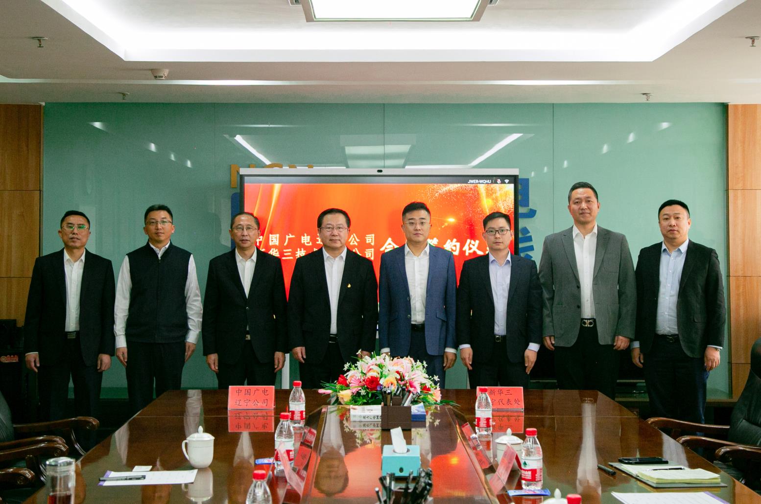 太阳成集团tyc技术工程部(5G建设中心)总经理李大明、信息管理部总经理郑庆刚、新华三辽宁代表处运营商主管李威、广电销售经理彭磊出席了签约仪式。