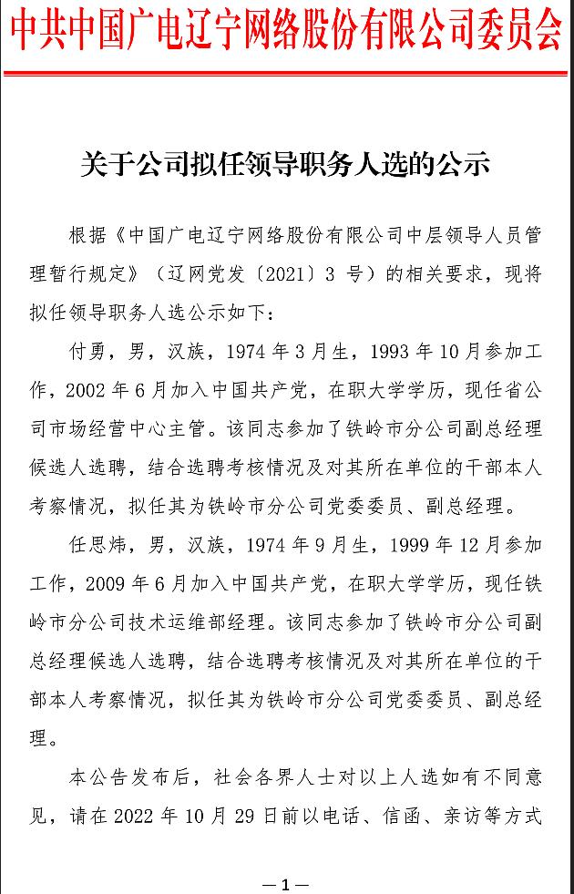 根据《太阳成集团tyc中层领导人员管理暂行规定》(辽网党发[2021]3号)的相关要求,现将拟任领导职务人选公示如下: