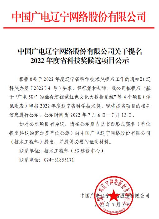根据《关于 2022 年度辽宁省科学技术奖提名工作的通知》(辽科奖办发〔2022〕4 号)要求,经征集和初审,我公司拟提名“基于广电网络5G AIOT的云智慧酒店融合平台”1 个项目(详见附表)申报 2022 年度辽宁省科学技术奖,现将提名项目的相关信息进行公示,公示时间为 2022 年 7 月 6 日—7 月 13 日。