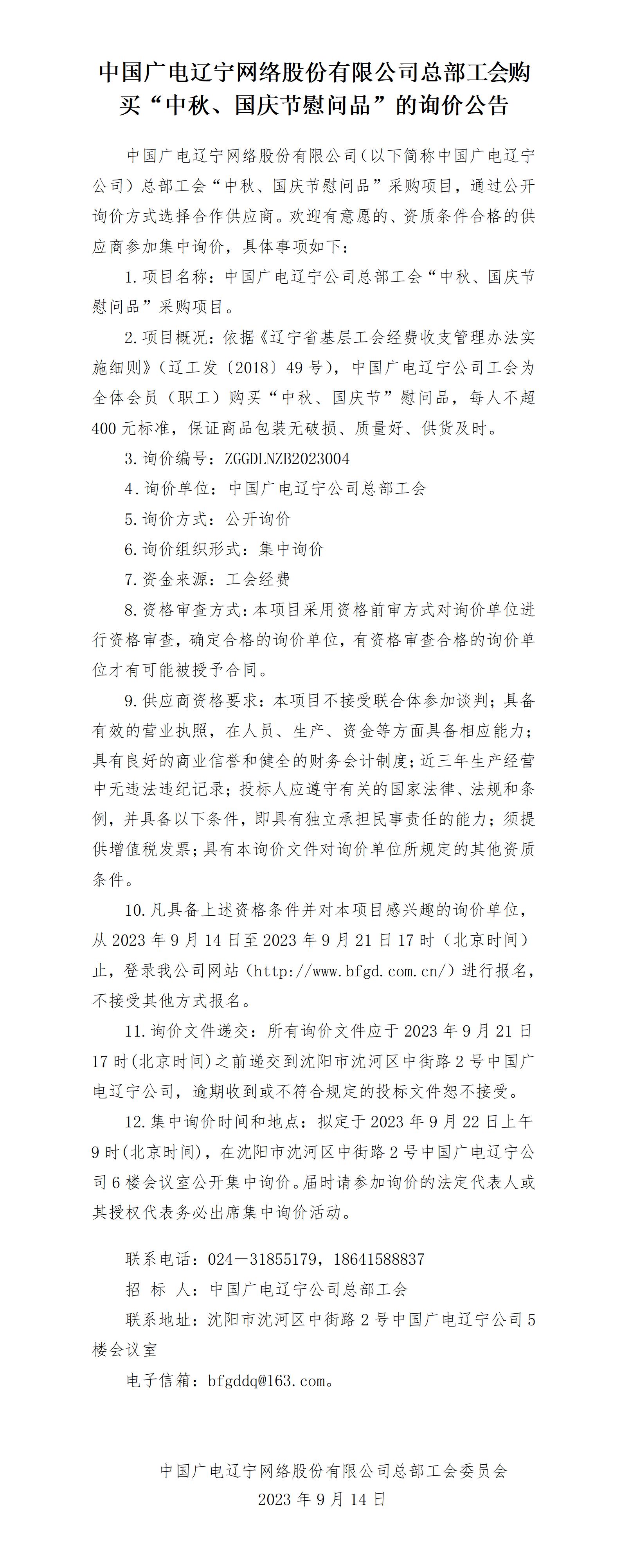 太阳成集团tyc总部工会购买“中秋、国庆节慰问品”的询价公告