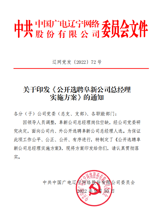 依据《公司中层领导人员管理暂行规定》(辽网党发〔2021〕3 号)的相关规定,经公司党委研究决定,面向公司内、外公开选聘阜新公司总经理人选。具体方案如下: