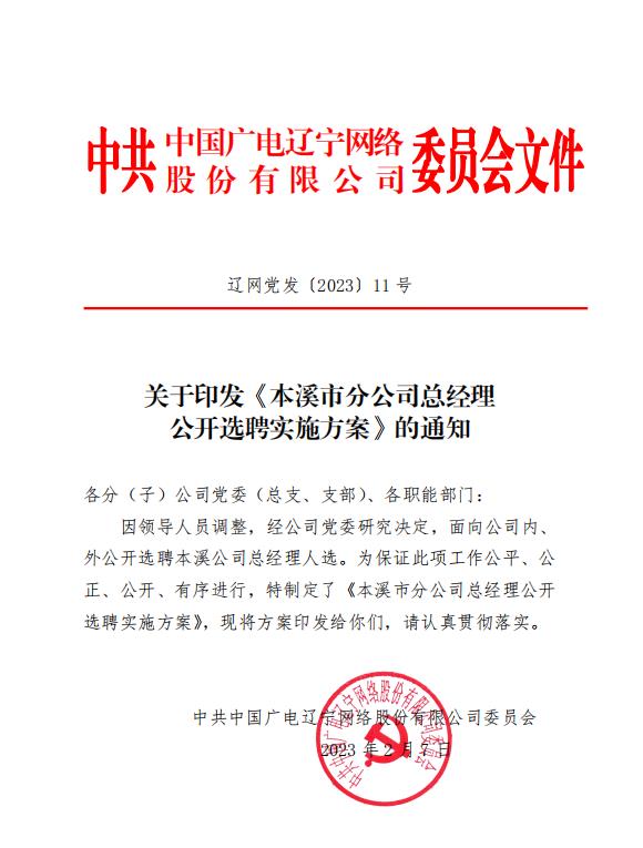 • 关于印发《本溪市分公司总经理 公开选聘实施方案》的通知