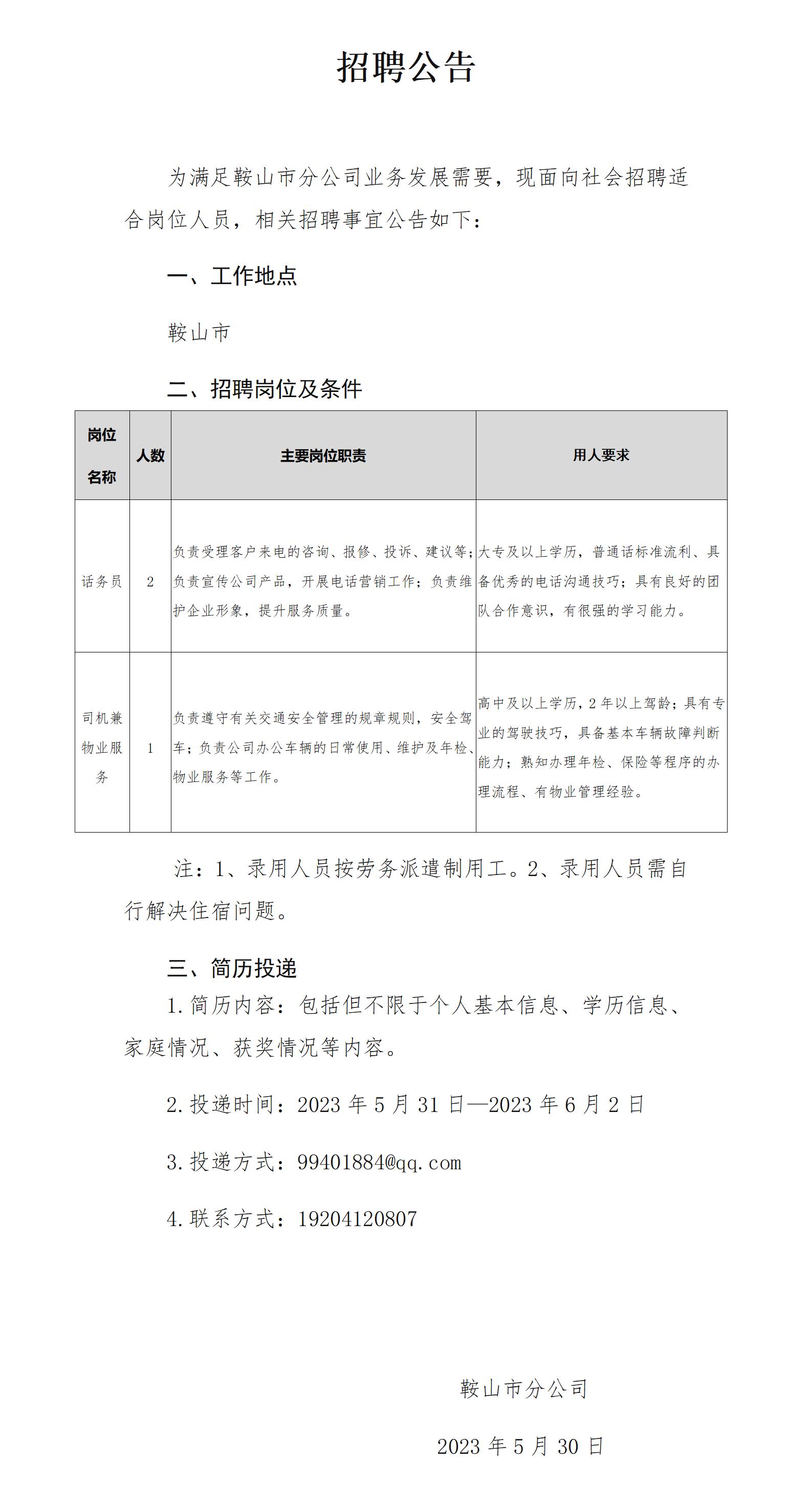 联系人: 鞍山市分公司 简历投递邮箱:99401884@qq.com